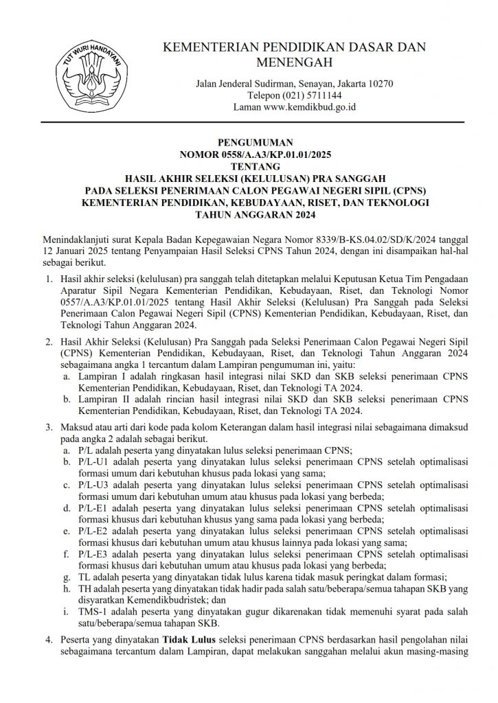 Pengumuman Hasil Akhir Seleksi (Kelulusan) Pra Sanggah Pada Seleksi Penerimaan Calon Pegawai Negeri Sipil (CPNS) Tahun Anggaran 2024