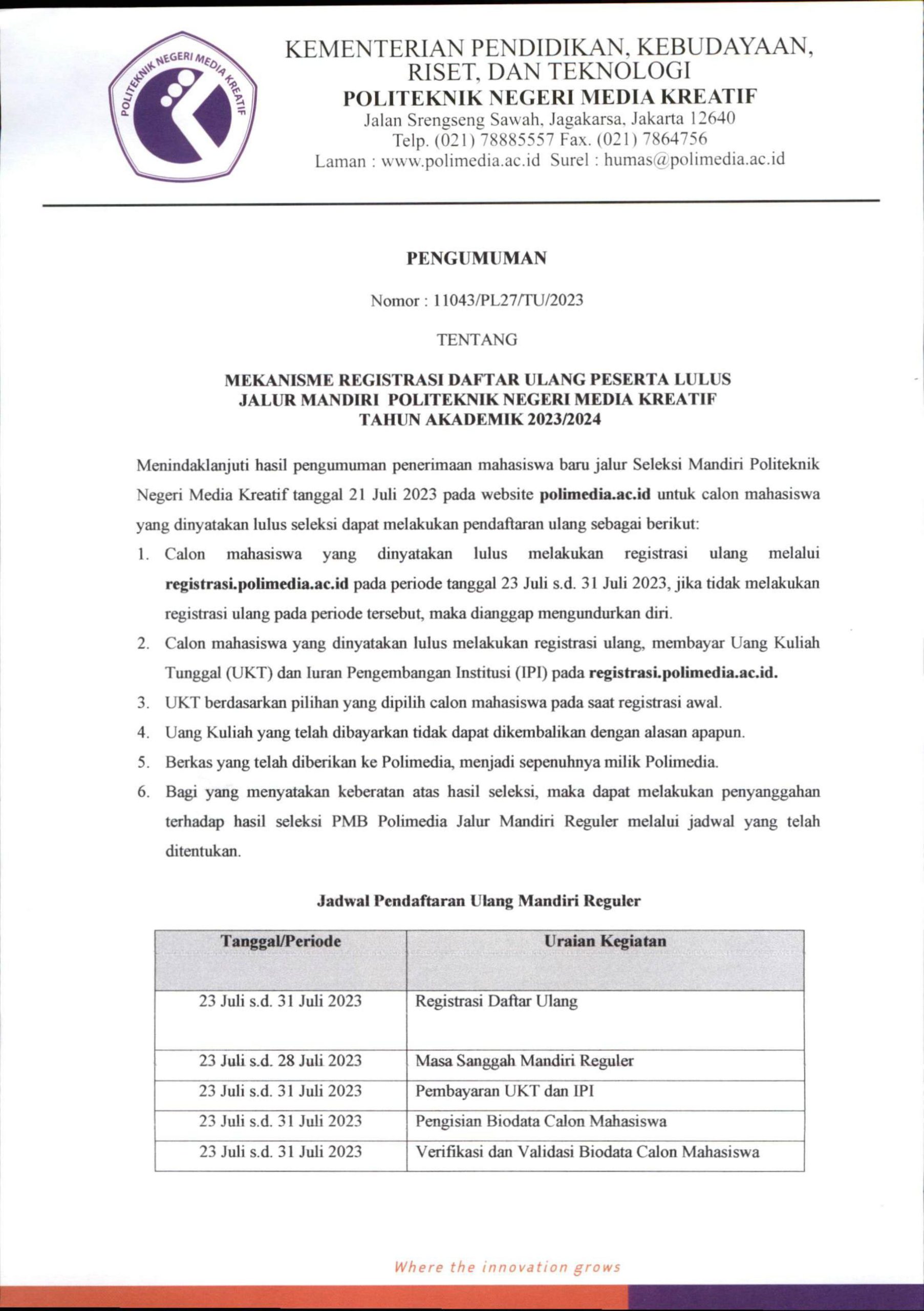 Mekanisme Registrasi Daftar Ulang Peserta Lulus Jalur Mandiri Politeknik Negeri Media Kreatif