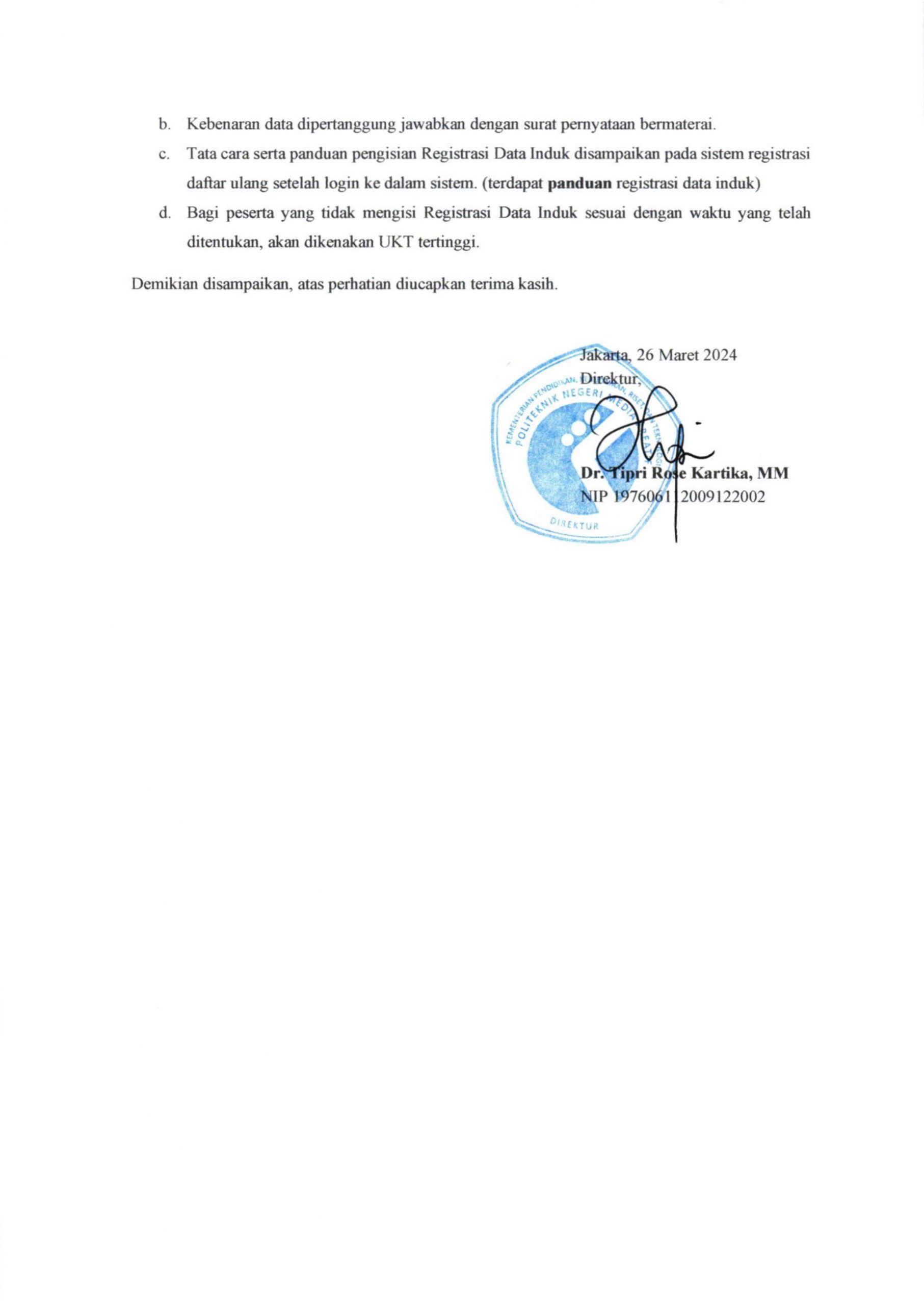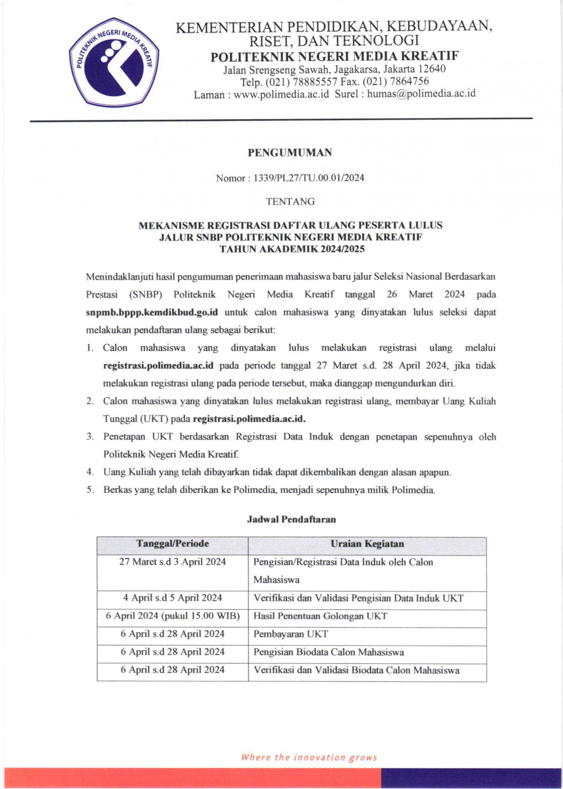 Mekanisme Registrasi Daftar Ulang Peserta Lulus Jalur SNBP Politeknik Negeri Media Kreatif Tahun Akademik 2024/2025