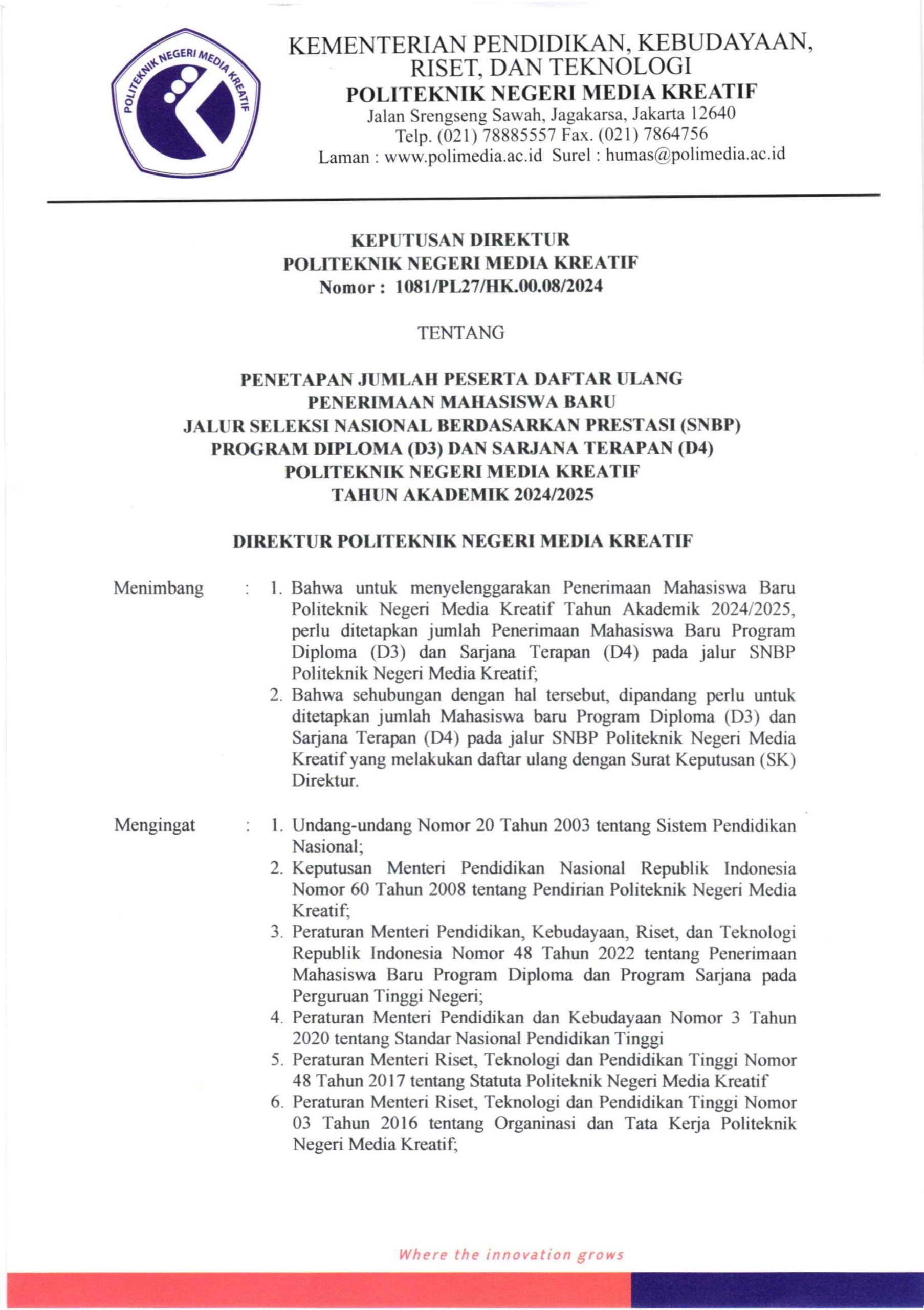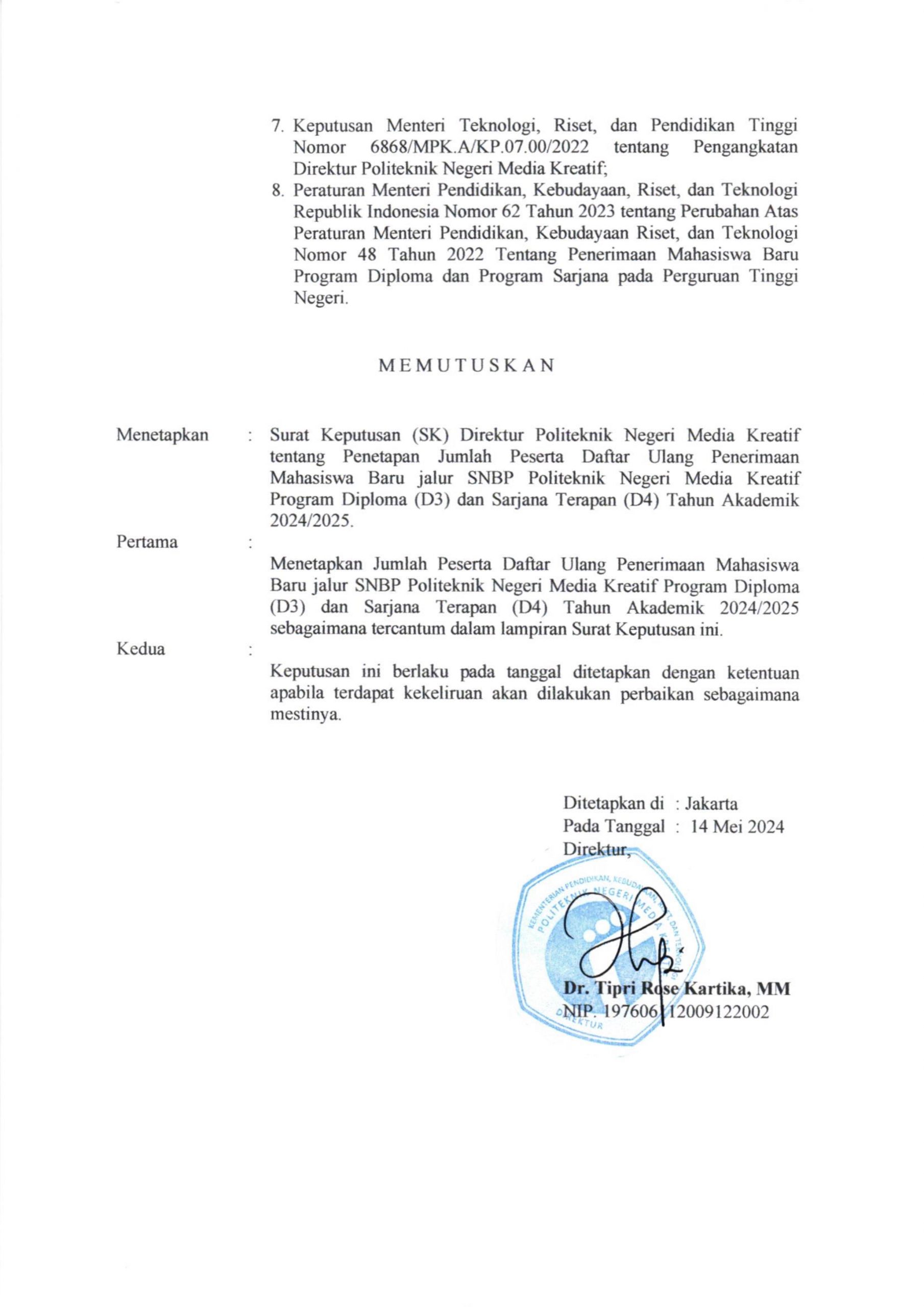 Penetapan Penerimaan Mahasiswa Baru Jalur SNBP 2024