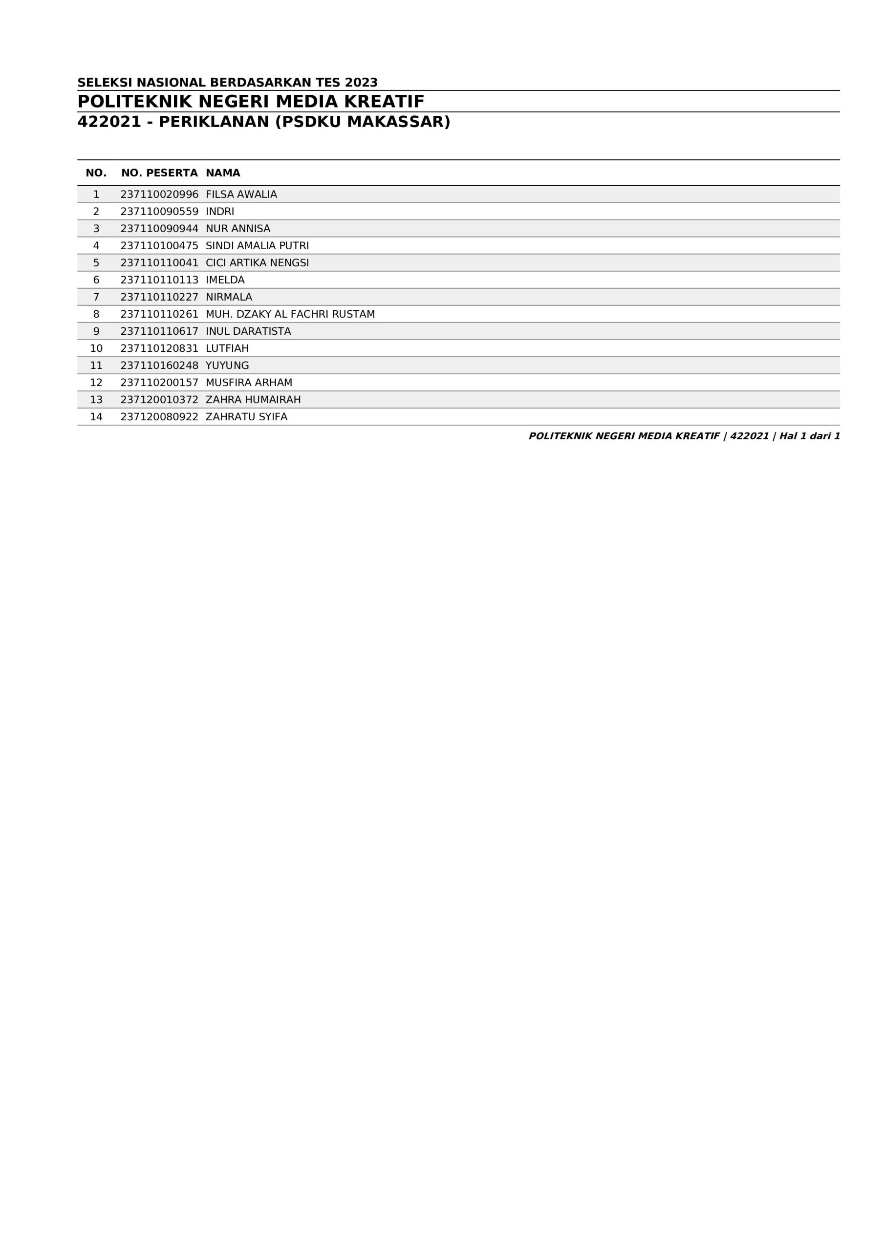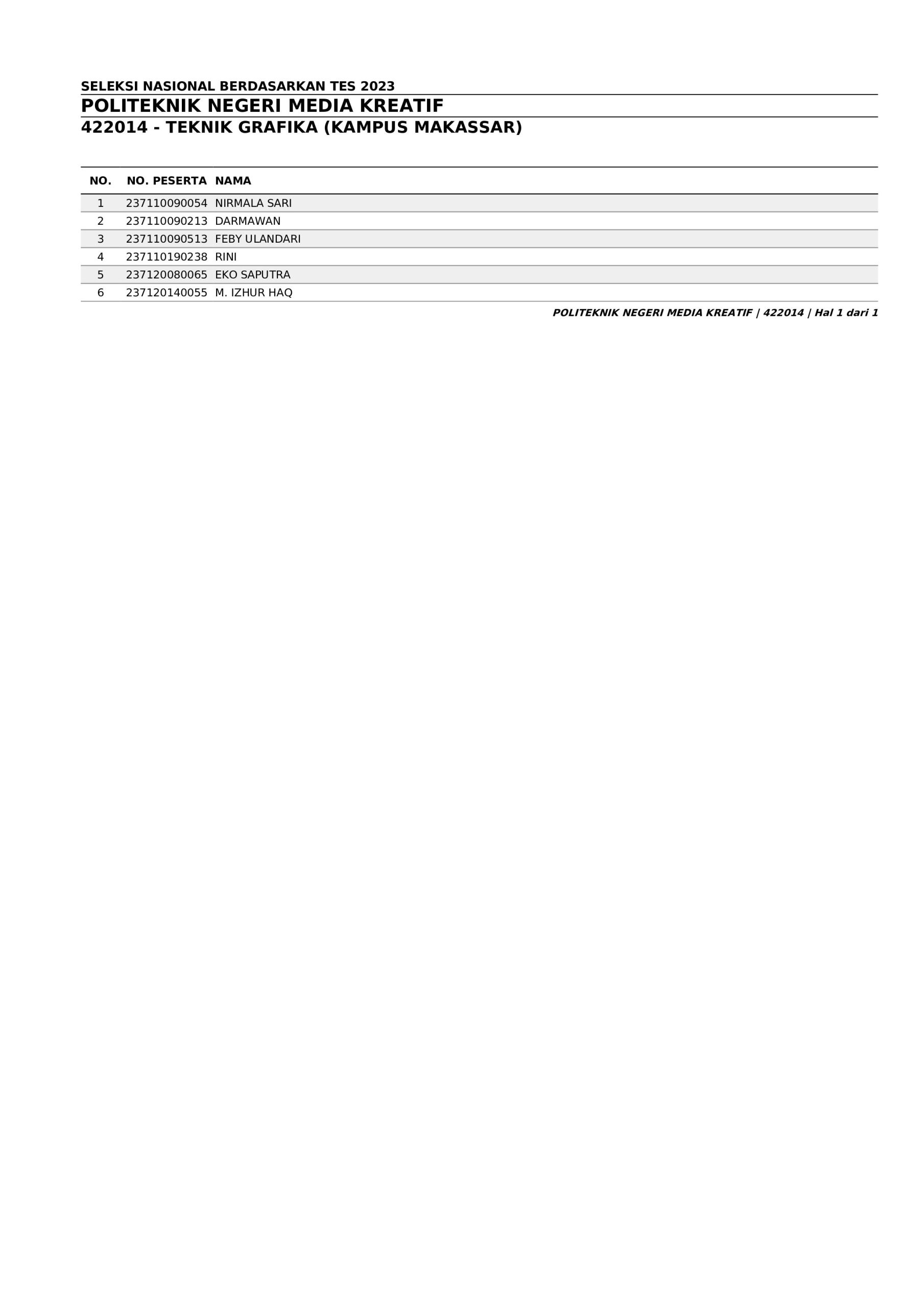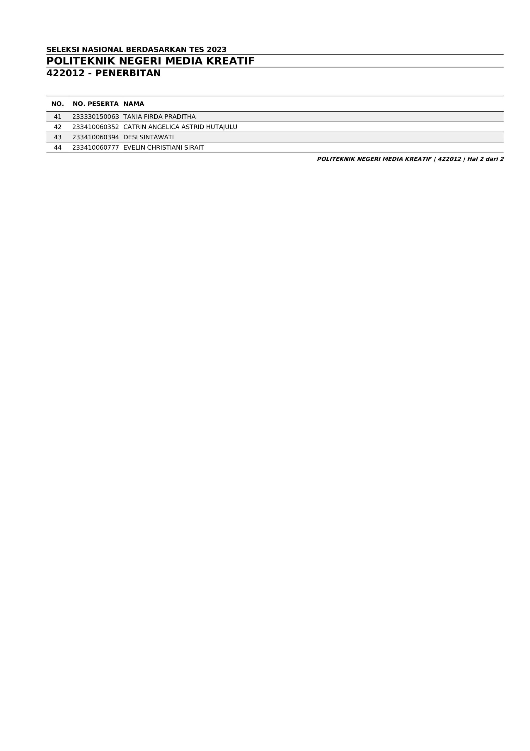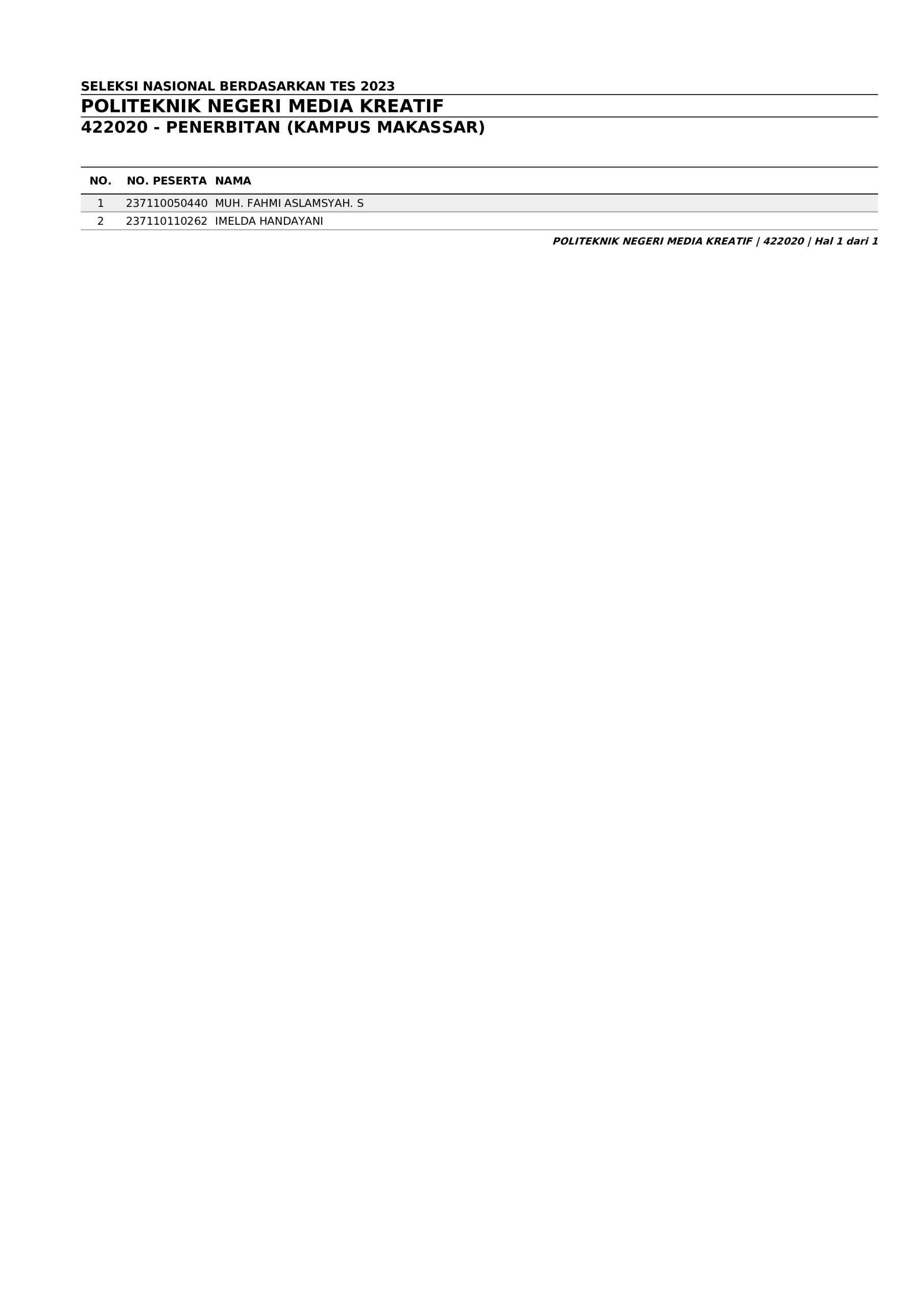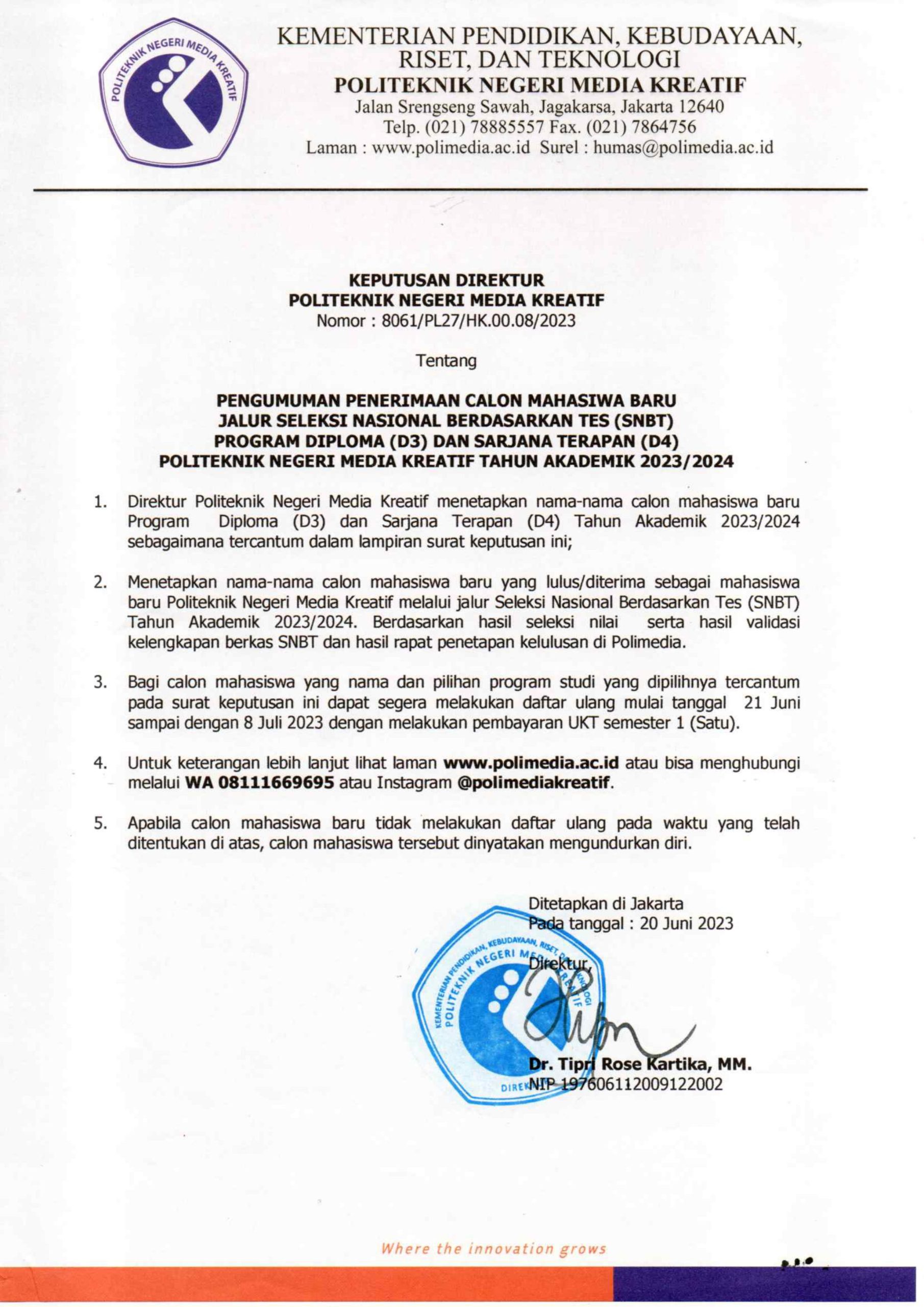 Pengumuman Hasil Penerimaan Calon Mahasiswa Baru Polimedia Jalur SNBT 2023