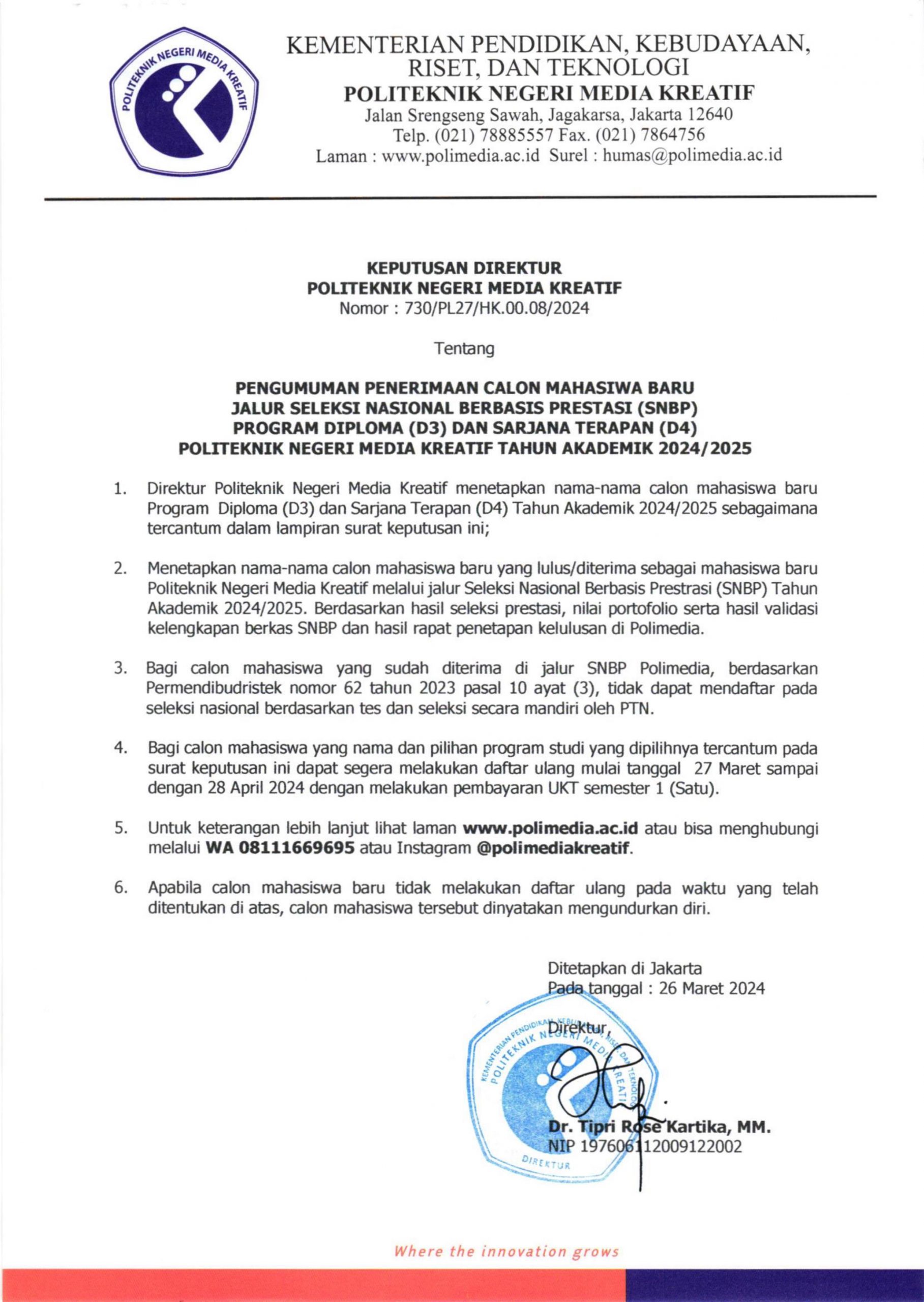 Pengumuman Hasil Seleksi Penerimaan Mahasiswa Baru Jalur Seleksi Nasional Berdasarkan Prestasi (SNBP) Polimedia Tahun Akademik 2024/2025