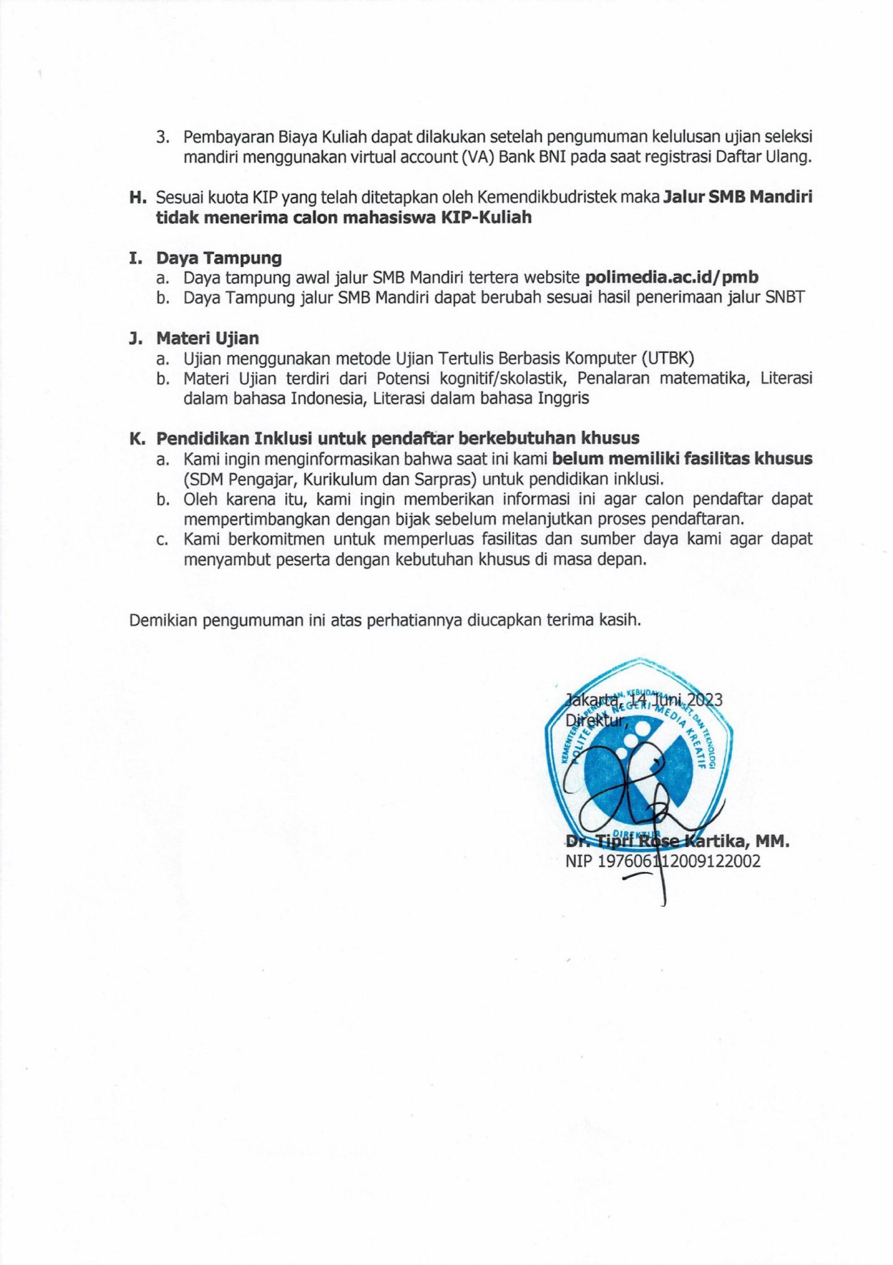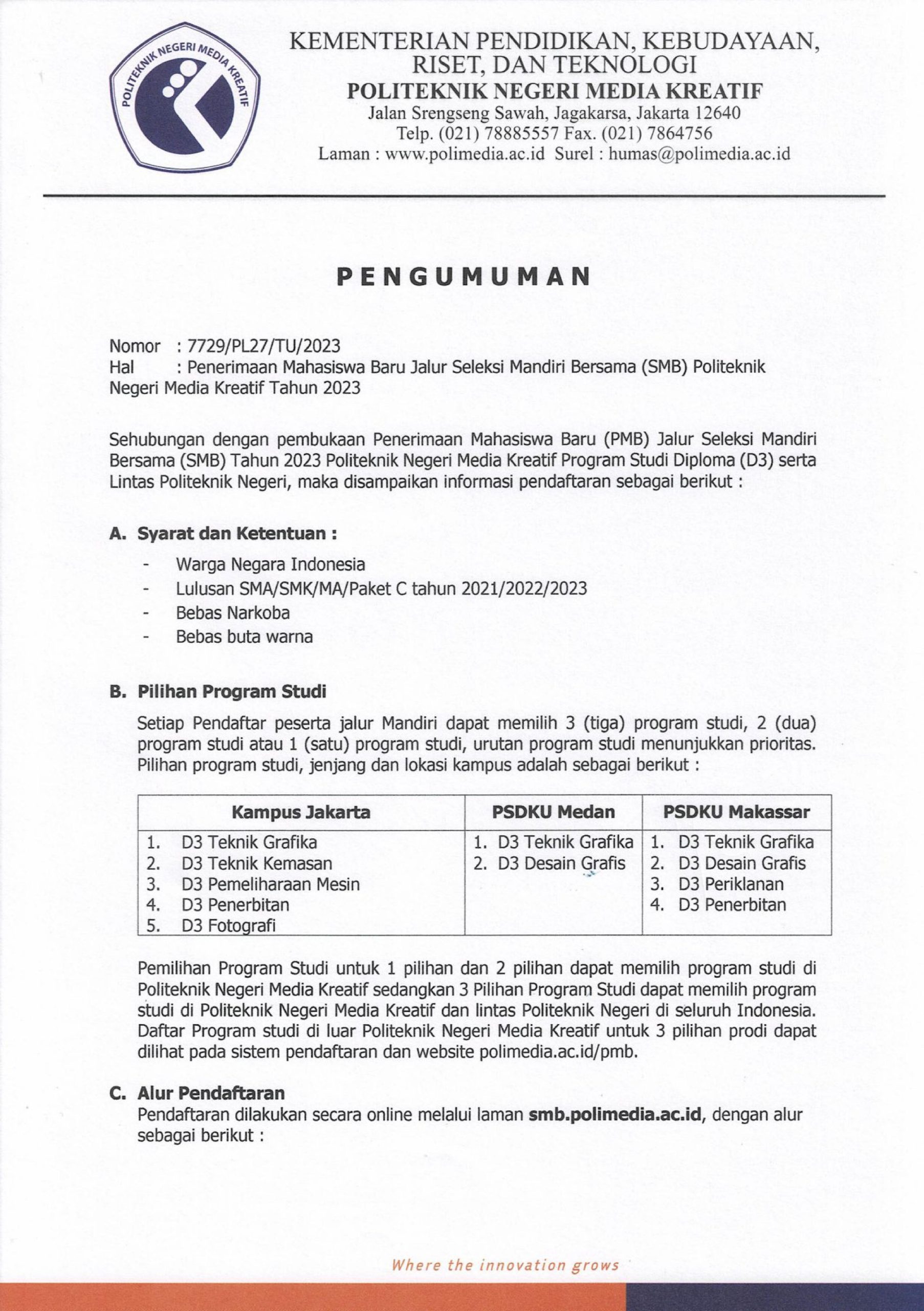 Pengumuman Penerimaan Mahasiswa Baru Jalur Seleksi Mandiri Bersama (SMB) Polimedia 2023