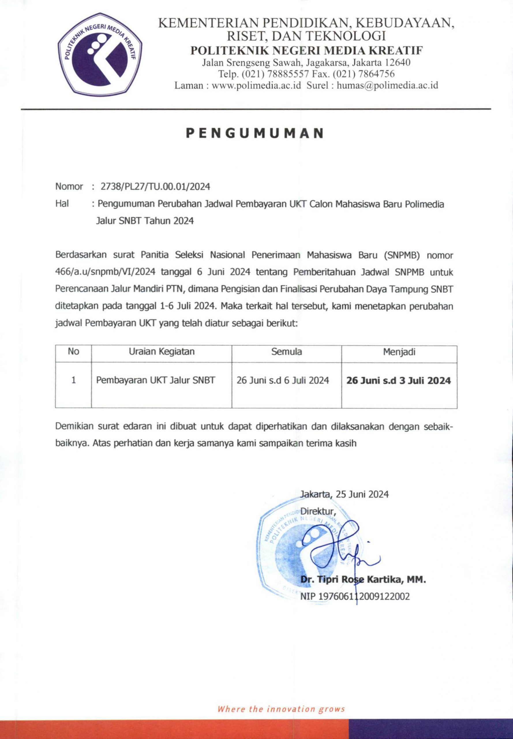 Pengumuman Perumahan Jadwal Pembayaran UKT Calon Mahasiswa Baru Polimedia Jalur SNBT Tahun 2024