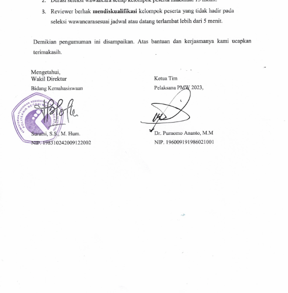PENGUMUMAN PESERTA LOLOS SELEKSI ADMINISTRASI PMW