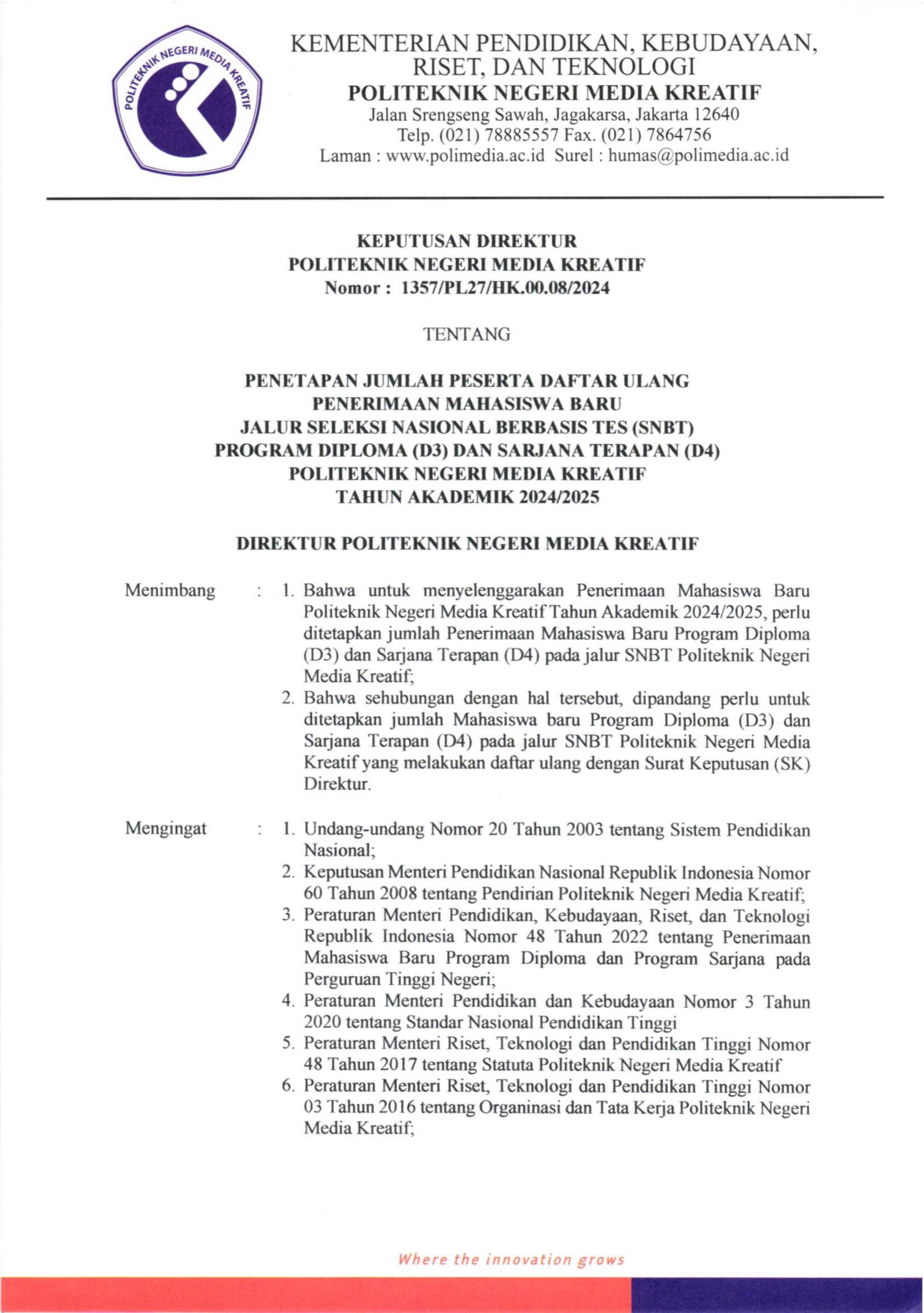 Surat Keputusan Penetapan Daftar Ulang Mahasiswa Jalur SNBT 2024