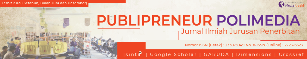 Publipreneur Polimedia (pISSN: 2338-5049 dan eISSN: 2723-6323) ini menyajikan penelitian-penelitian di bidang yang berkaitan dengan kompetensi penerbitan, antara lain periklanan, penyiaran, dan fotografi. Jurnal ini diterbitkan dua kali setahun setiap bulan Juni dan Desember.
